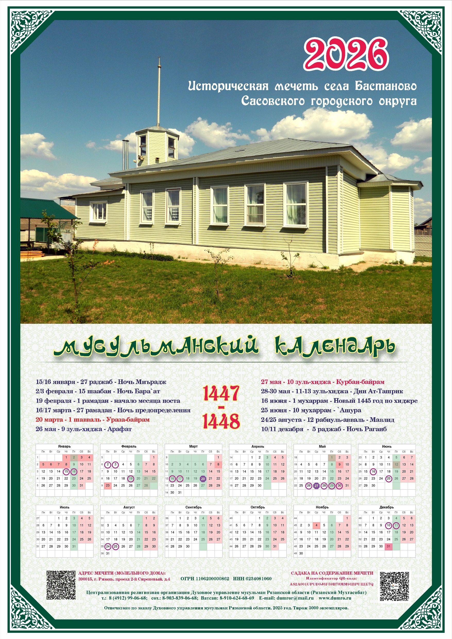 Расписание времени намазов на 2026 год для городов Рязанской области: