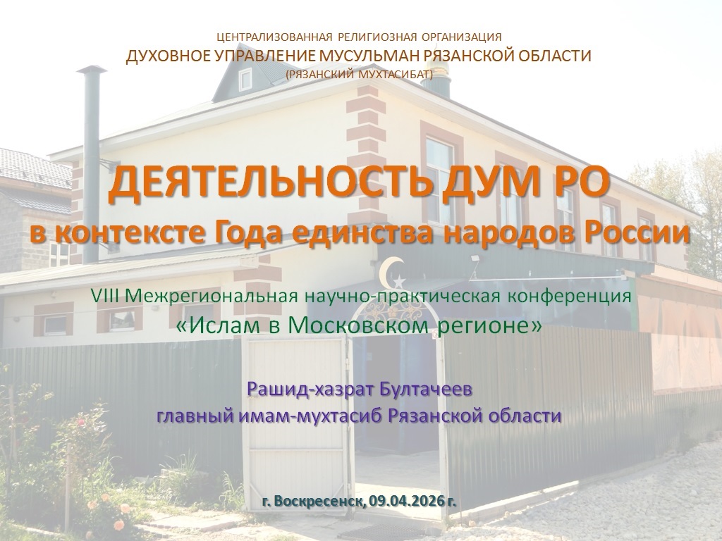 9 апреля 2026 года, в Центральной библиотеке им. Инны Гофф в Воскресенске Московской области состоялась VIII Межрегиональная научно-практическая конференция «Ислам в Московском регионе», приуроченная к Году единства народов России и прошедшая под общей темой: «Единство народов России в истории и современности». В научном событии участвовали кандидат философских наук, заместитель председателя Духовного управления мусульман Российской Федерации, председатель Духовного управления
